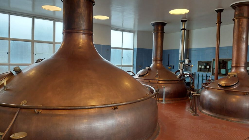 In de brouwzaal staan 3 prachtige koperen ketels met een maximum capaciteit van 27.000 liter. Per batch brouwen ze in deze ketels 13.000 liter bier. Dit doen ze 2 tor 3 keer op een dag en dus zo’n 480 keer per jaar. Dat betekent meer dan 6 miljoen liter bier per jaar. Een deel van de brouwsels gaan echter niet vanuit de brouwzaal naar de vergistingtanks maar naar de stokerij om er whiskey van te maken.